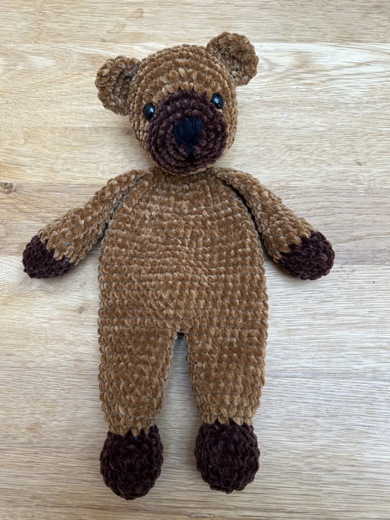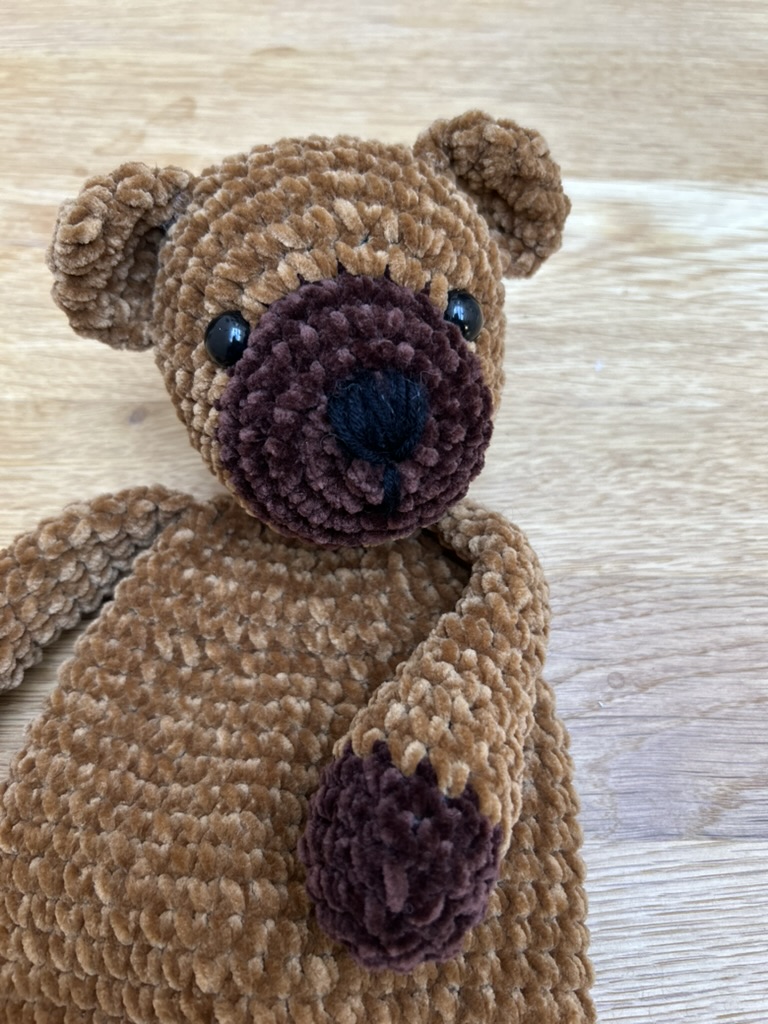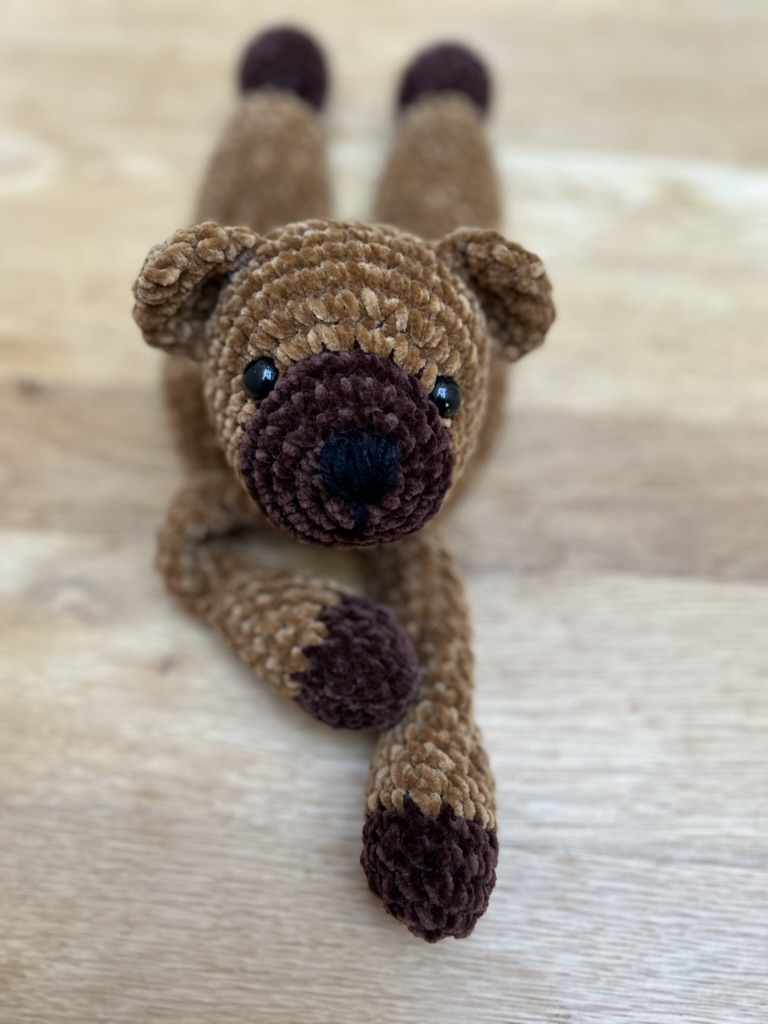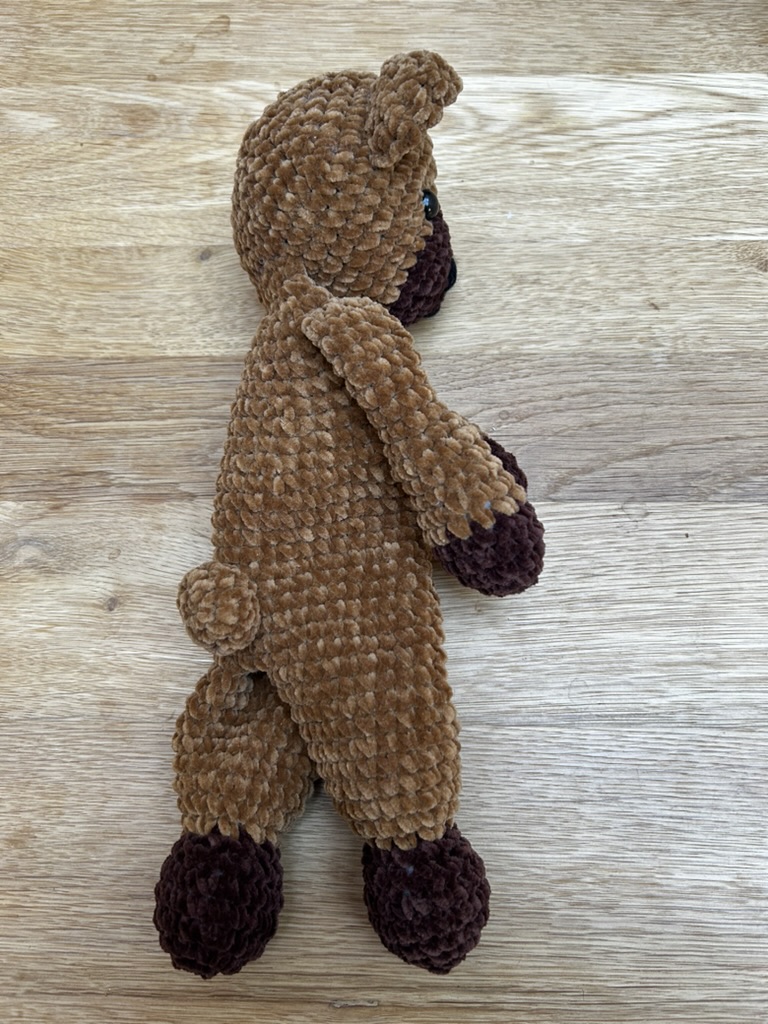 Lief zacht knuffelbeertje. Het beertje is gehaakt met velvet garen en is 35 cm lang.