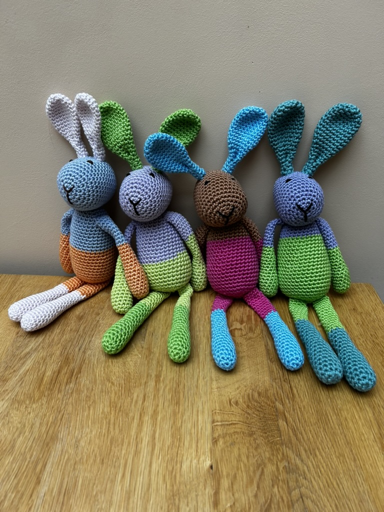 Een heerlijke knuffel om overal mee naartoe te nemen. De haas is gehaakt met vrolijke kleuren katoen en is ongeveer 45 cm lang.