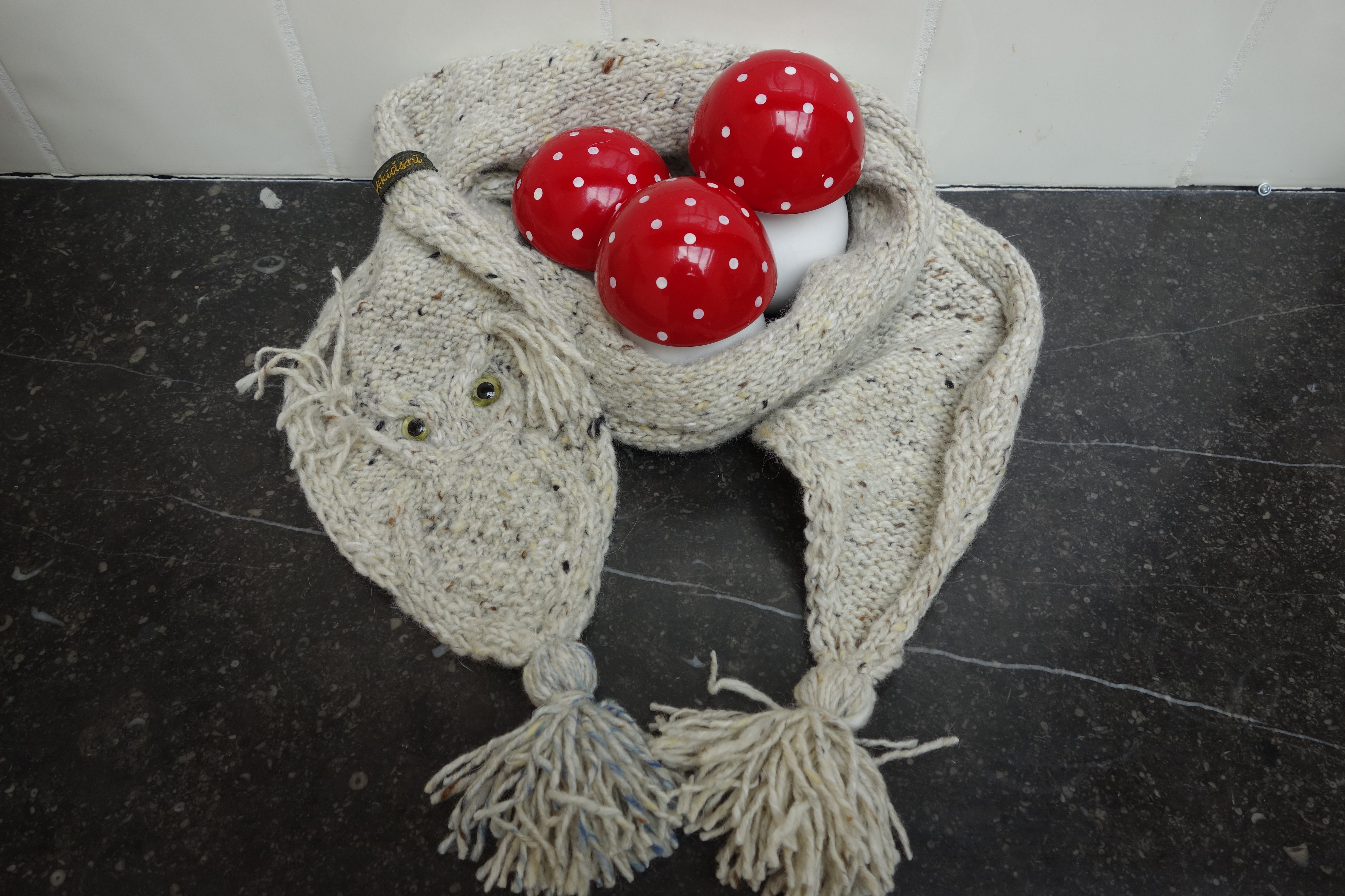 Daar is de uil weer, nu aan het uiteinde van een sjaal. Het is een uitdaging om producten te breien die gebaseerd zijn op dieren, voor kinderen is dat altijd leuk. De sjaal is gebreid met een heel mooi garen, wol met toevoeging van een beetje angora. Het ingebreide uiltje aan een uiteinde van de sjaal is erg grappig. De sjaal past mooi bij de muts Oehoeboeroe.